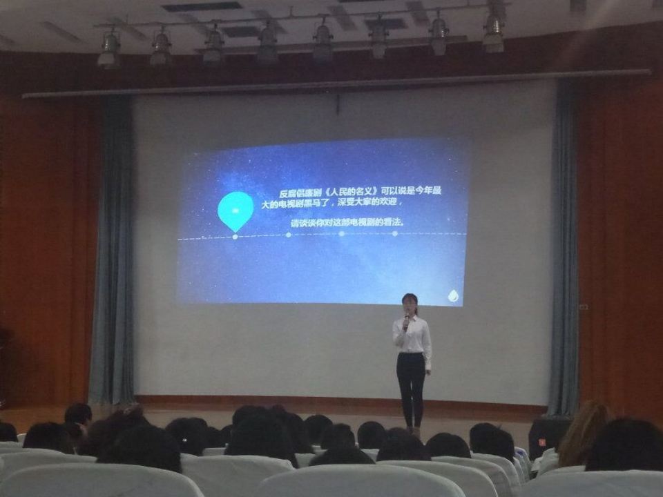 经过初赛,复赛的层层选拔,来自全校的十名选手一路披荆斩棘,终于站在了今天决赛的舞台上。大赛分为即兴评述和合作空间两个环节。在第一环节中,参赛选手抽取试题并进行自由评述,德赢官网的7号选手谷晶晶,以对《人民的名义》的看法为题,进行了即兴的点评,展现了高超的临场发挥能力,获得现场阵阵掌声。在合作空间环节中,选手们随机应变,现场更是高潮迭起。谷晶晶表现的非常出色,她与随机搭档配合默契,用精湛的演技与流利的话语完美的诠释了婚礼司仪的角色。最终,谷晶晶获得二等奖的好成绩。