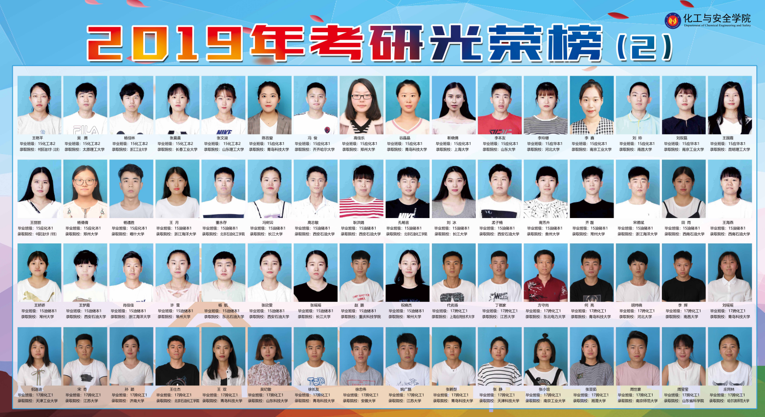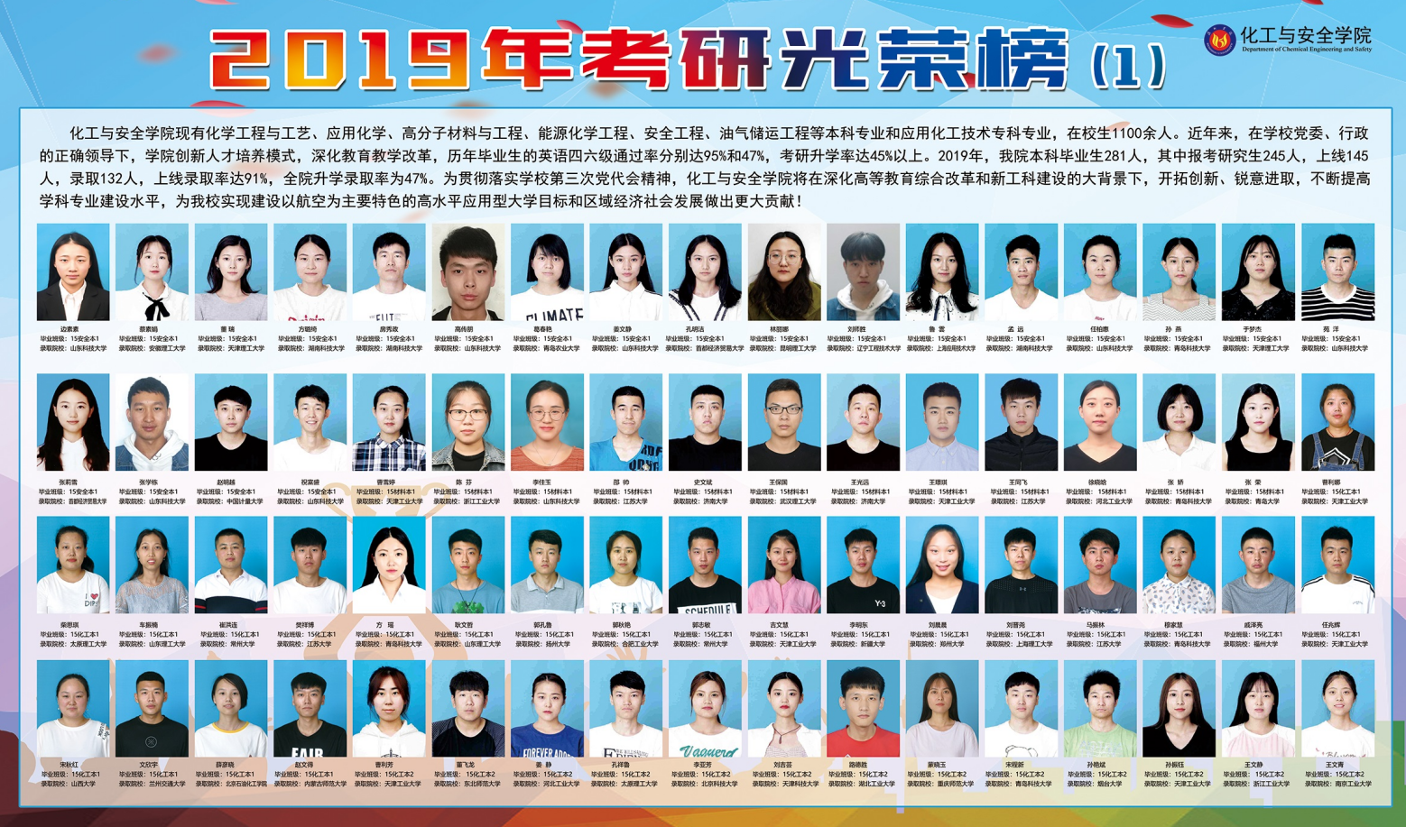 近日,2019全国研究生招生录取工作结束,德赢官网成绩喜人。德赢官网19届本科毕业生281人,其中报考研究生245人,上线145人,录取132人,上线录取率达91%,全院升学录取率为47%。近年来,化工与安全学院不断深化高等教育综合改革和新工科建设,开拓创新、锐意进取,不断提高学科专业建设水平,为我校实现建设以航空为主要特色的高水平应用型大学目标和省内一流,国内知名的化工与安全学院做出更大贡献!