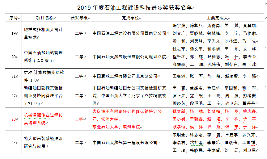 近日,2019年度石油工程建设科学技术奖评审工作圆满结束,德赢官网耿孝恒博士与大庆油田有限责任公司储运销售分公司等共同申报的“机械清罐作业过程仿真培训系统”成果荣获中国石油工程建设协会科技进步奖二等奖,我校为第四完成单位。这是我校获得的首个此类奖项。